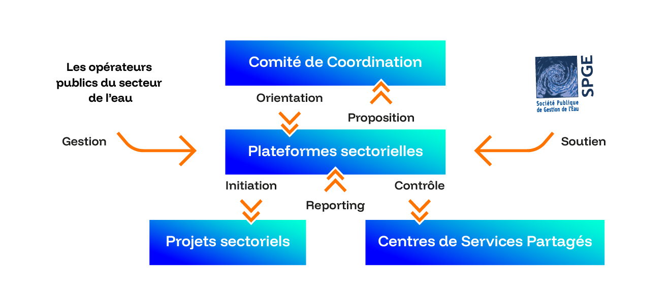 Le Code de l’Eau confie à la SPGE la mission d’intervenir dans les opérations relevant du cycle de l’eau, de favoriser leur coordination et de développer des synergies. La gouvernance du secteur de l’eau est ainsi gérée par le Comité de Coordination institué au sein de la SPGE. Ce Comité a pour objectif de piloter la mise en œuvre de la stratégie sectorielle inscrite dans le Plan industriel et superviser l’activité des plateformes sectorielles.